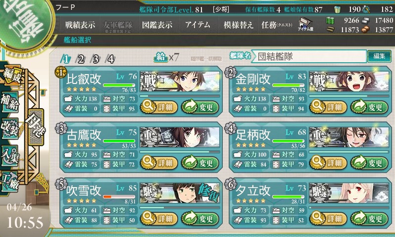 そして今後は6-1と2-5の攻略、あとはまだ育ってない航巡や潜水艦の育成をやっていこうと思ってます。