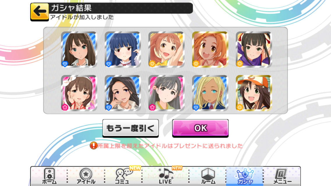 この調子ですとまた3ヶ月後・・・9月の終わりか10月の頭くらいにシンデレラフェスが来そうなので、またここからジュエルを貯める生活に戻りますか・・・