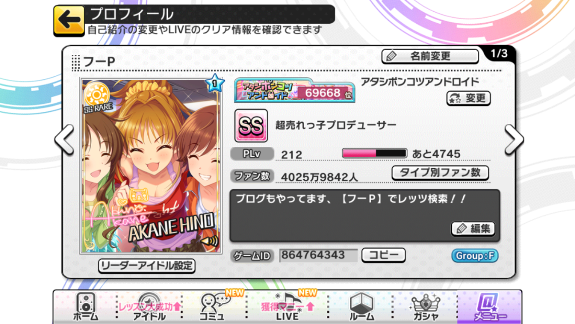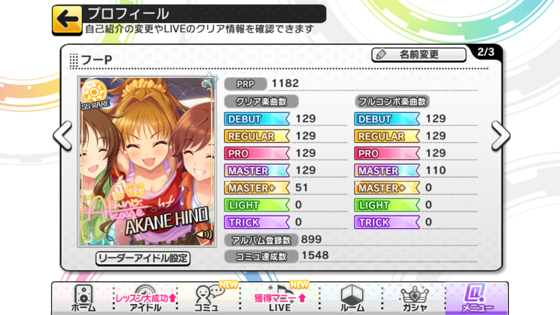 (リーダーカードの日野茜は今回の40連で唯一来てくれたSSRです、隣にいるちゃんみおはわたしの未練・・・【プロフィール】