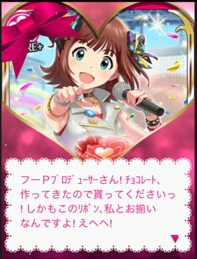 ファ!?春香のリボンとお揃い!?一生首に巻いて生きていきます。そして後々知ったんですが、チョコもらうチャンスが3回あって、その都度リーダーを変えていれば他のキャラのコメント見れたらしい・・・結局全部SF春香にもらってしまった