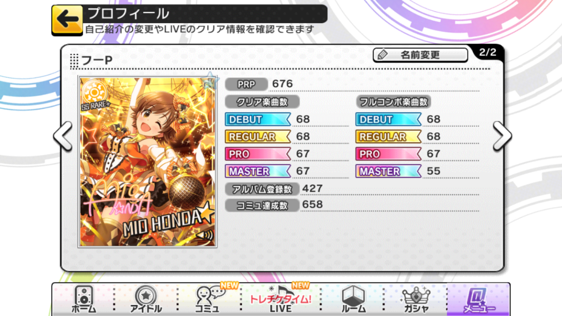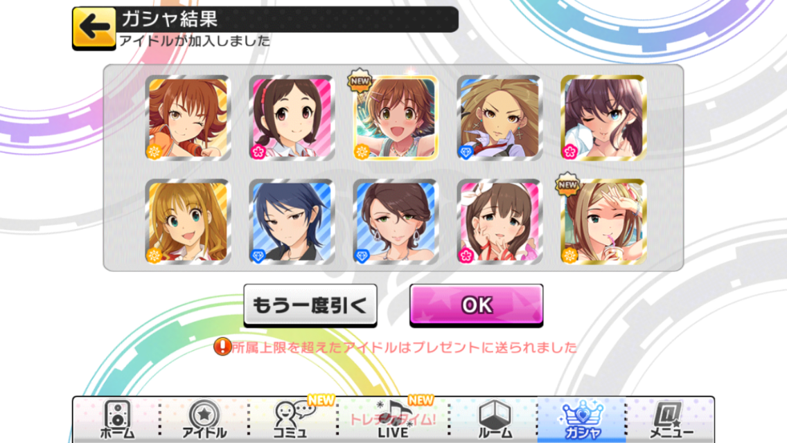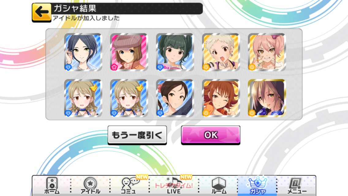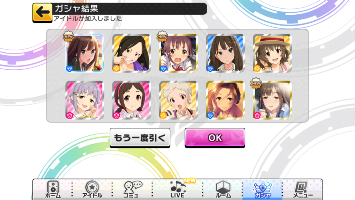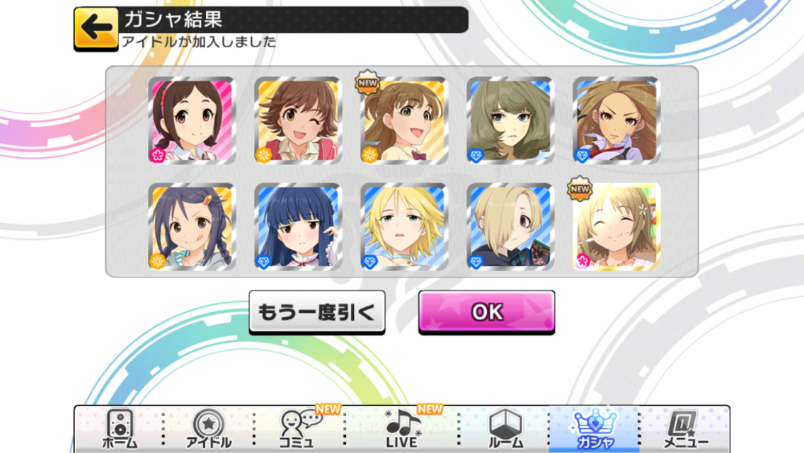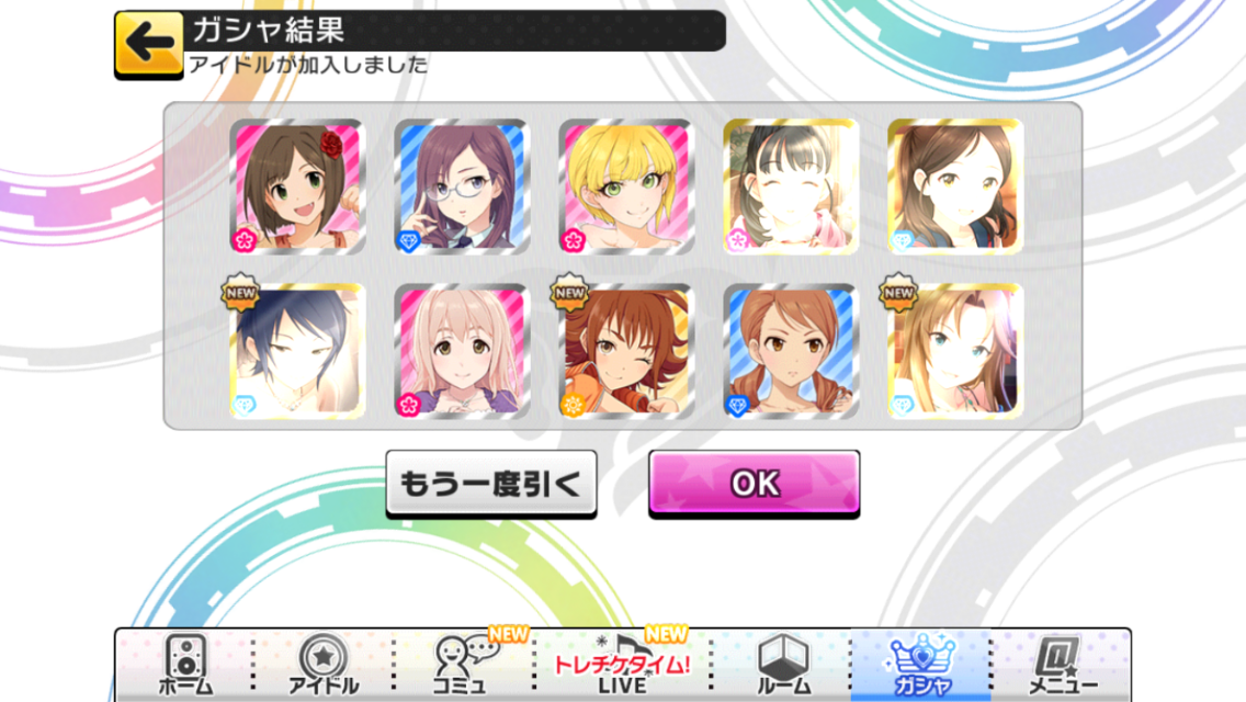 そして50連目くらいにちゃんみおが来てくれて、自分の今までの引き的に正直ここでもう満足度はMAXでしたがトドメに卯月も来てくれたのでフーP大感謝、それと同時にNGの絆はすごいなと感じました。