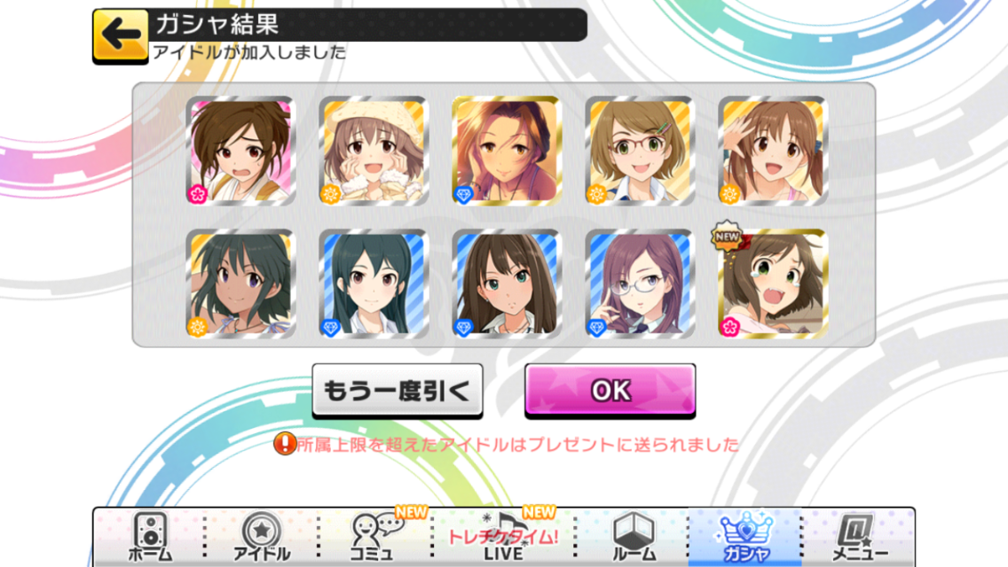 この調子ですとまた3ヶ月後・・・9月の終わりか10月の頭くらいにシンデレラフェスが来そうなので、またここからジュエルを貯める生活に戻りますか・・・
